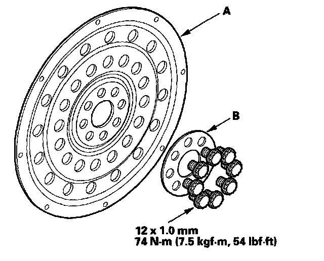 Torque the flywheel mounting bolts (B) in a crisscross pattern in several steps.
