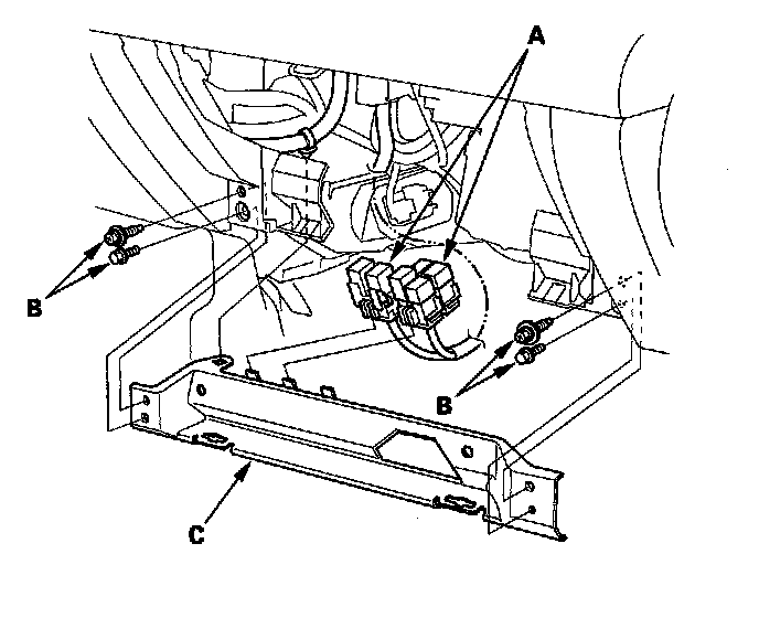 10. Remove the relays (A), then remove the bolts (B) and the glove box frame (C).