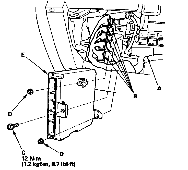 13. Remove the PCM mounting bolt (C) and the bracket.