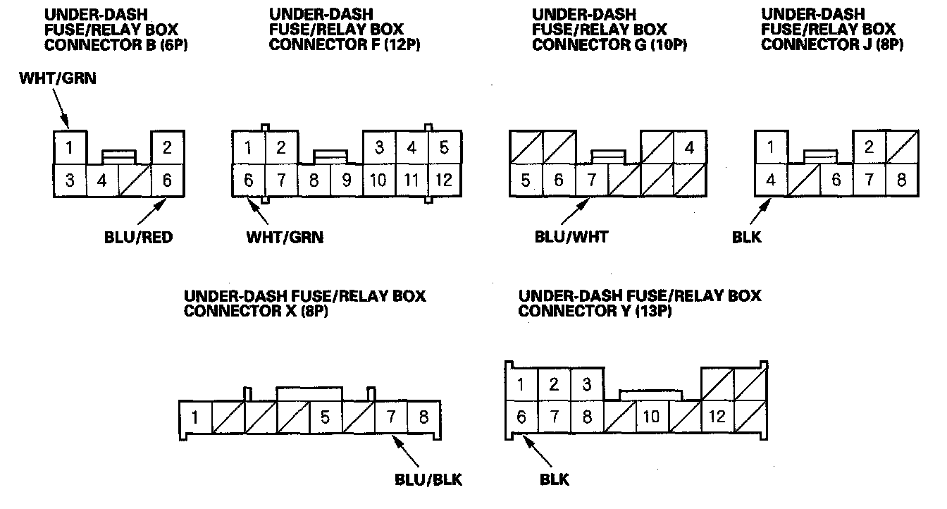 3. Disconnect the under-dash fuse/relay box connectors B, F, G, J, X and Y.