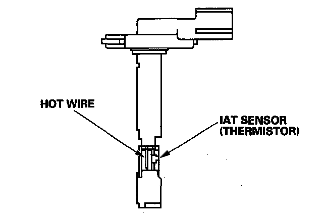 The mass airflow (MAF) sensor/intake air temperature (IAT) sensor contains a hot wire and a thermistor. It is located in the intake air passage. The resistance of the hot wire and thermistor change due to intake air temperature and airflow. The control circuit in the MAF sensor controls the current to keep the hot wire at a set temperature. The current is converted to voltage in the control circuit, then output to the ECM/PCM.