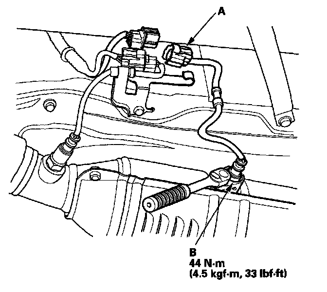 1. Disconnect the secondary HO2S 4P connector (A), then remove the secondary HO2S (B).