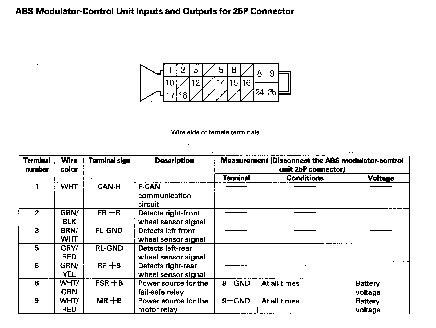 ABS Modulator-Control Unit Inputs And Outputs For 25P Connector (Part 1):