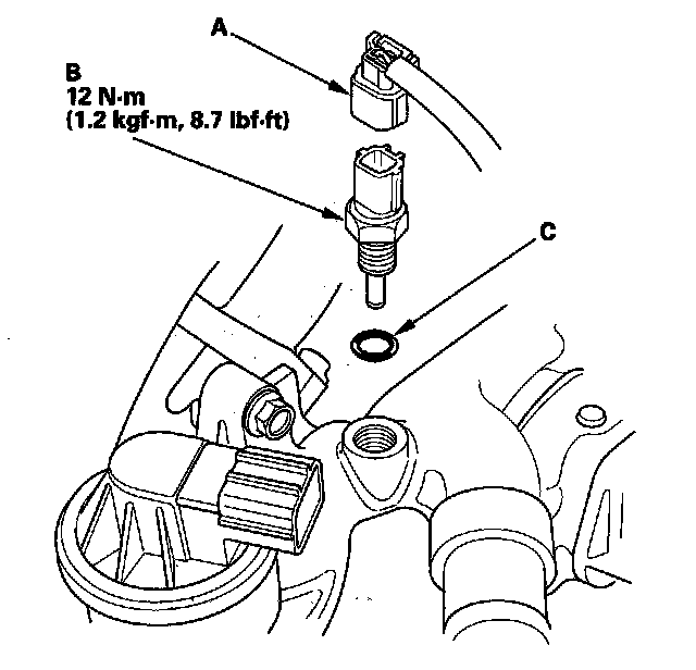 5. Install the parts in the reverse order of removal with a new O-ring (C), then refill the radiator with engine coolant, and bleed air from the cooling system with the heater valve open.