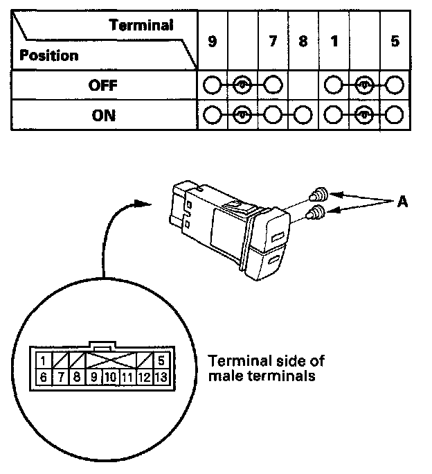 3. Check for continuity between the terminals in each switch position according to the table. If there is no continuity, replace indicator bulbs (A) or the switch.
