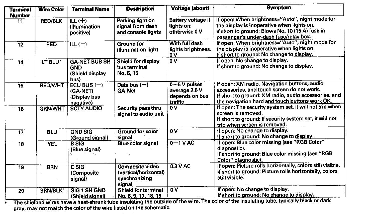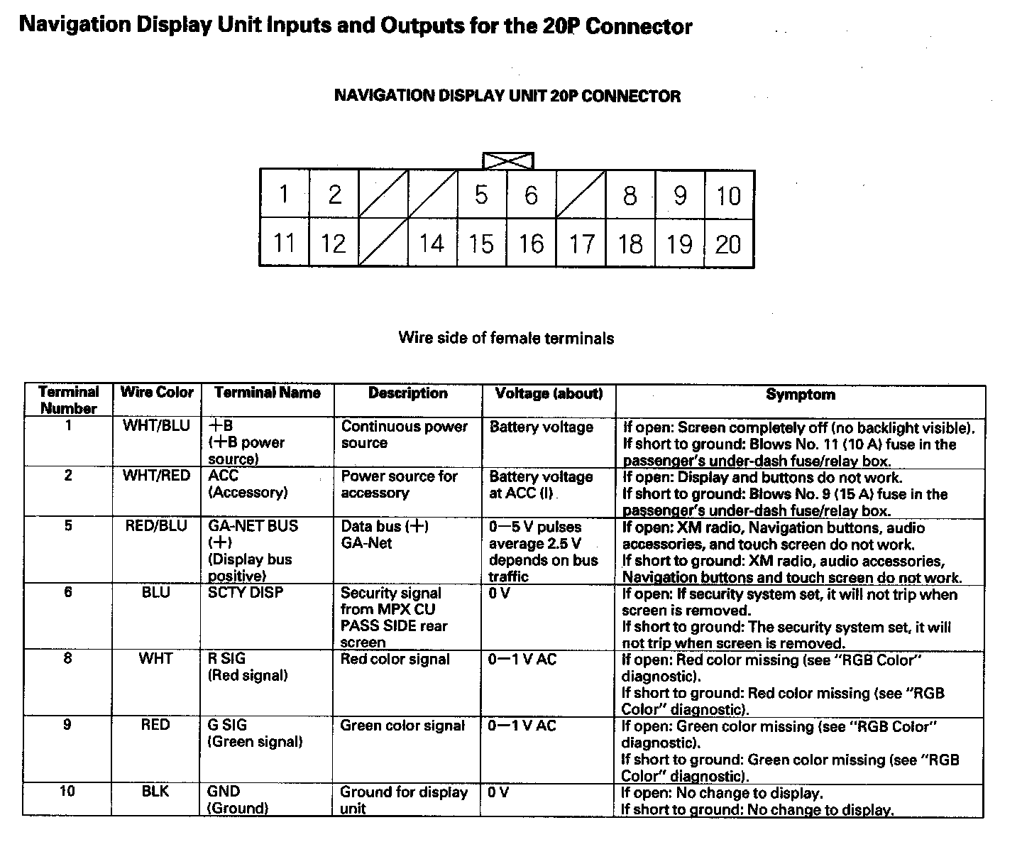 Navigation Display Unit Inputs And Outputs For The 20P Connector (Part 1):