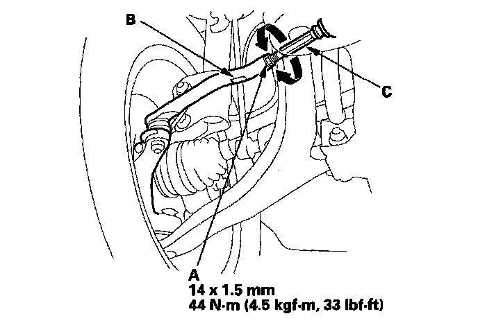 3. Hold the adjusting bolt (A) on the rear lower arm B, and loosen the self-locking nut (C).