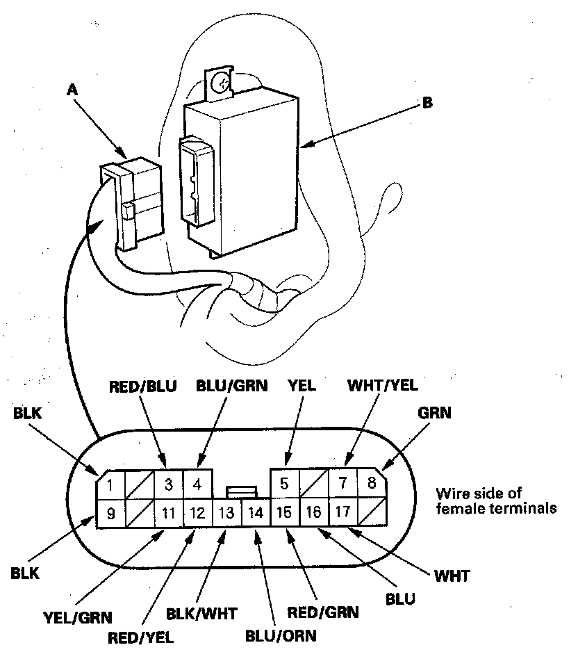 2. Disconnect the 18P connector (A) from the power window control unit (B).