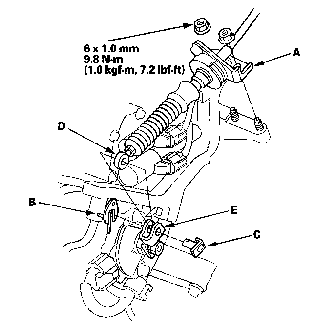 7. Remove the spring clip/washer (B) and the control pin (C), then separate the shift cable end (D) from the control lever (E).