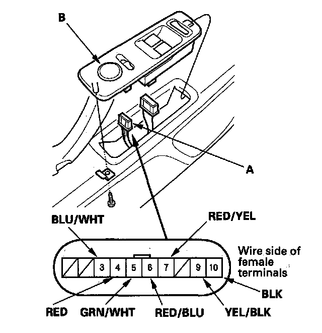 2. Disconnect the 10P connector (A) from the power mirror switch (B), and inspect the terminals. If the terminals are OK, go to step 3.