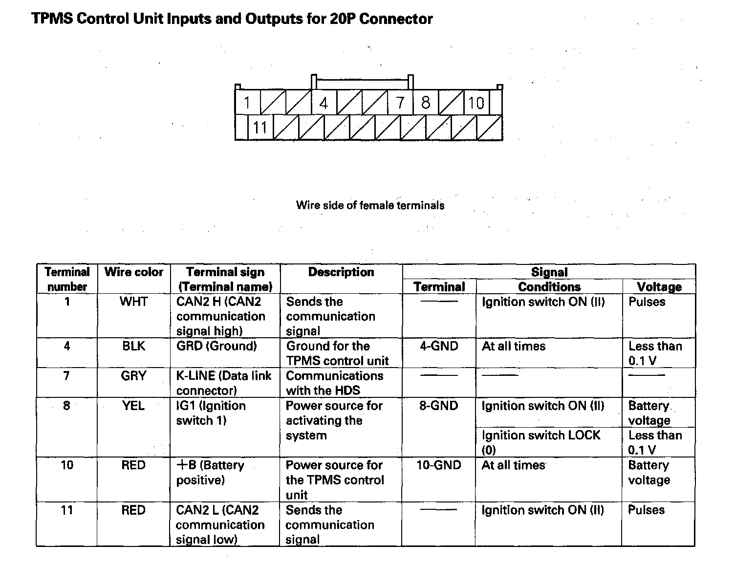 TPMS Control Unit Inputs And Outputs For 20P Connector: