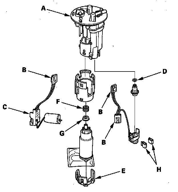 4. Install the parts in the reverse order of removal with a new O-rings (D), new bracket (E), new spacer (F), new grommet (G), and new clips (H). Then installing the fuel tank unit.