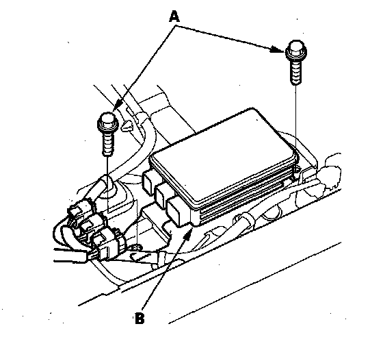 4. Disconnect the connectors. Remove the mounting bolts (A) and the passenger's weight sensor unit (B) from the seat riser.