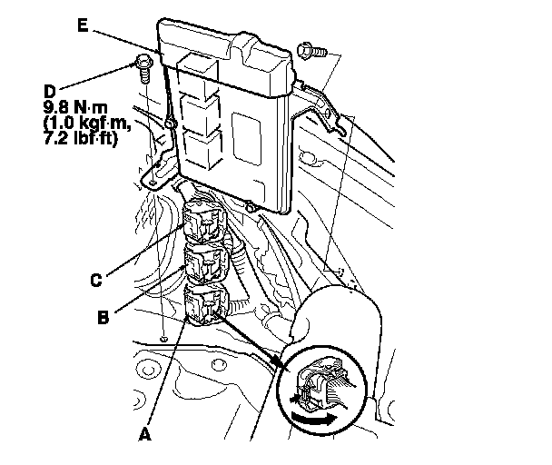 14. Disconnect ECM/PCM connectors A, B, and C, then remove the ECM/PCM assembly (E).