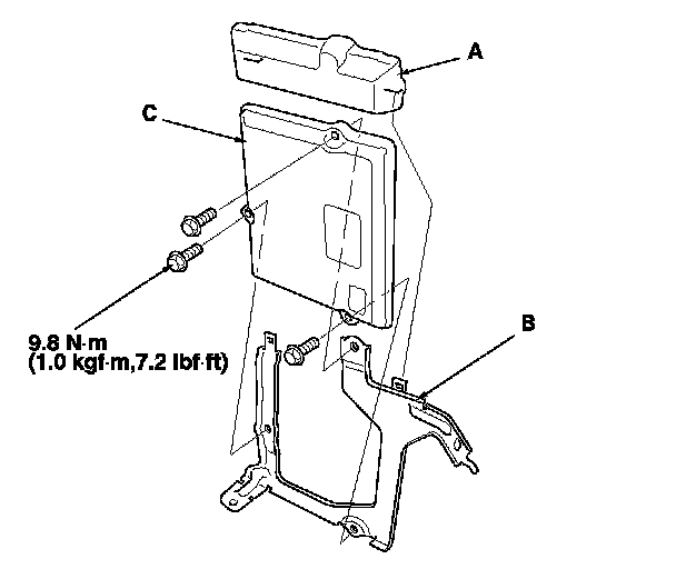 15. Disconnect the cover (A) and the bracket (B) from the ECM/PCM (C).