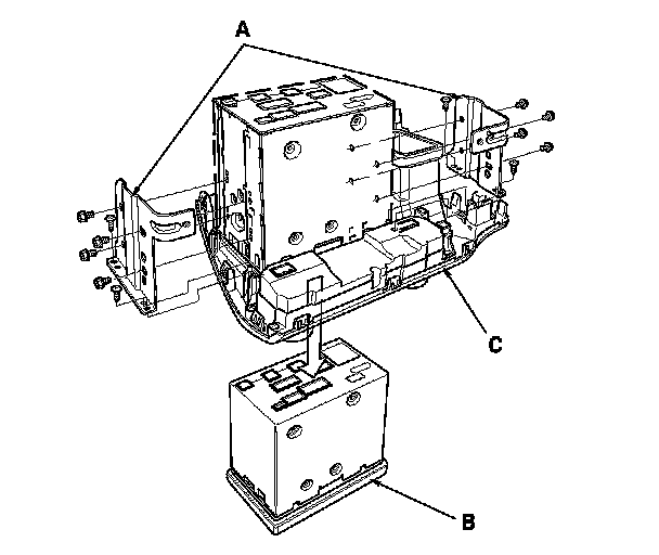 6. Remove the screws, brackets (A), and the navigation unit (B) from the center panel (C).