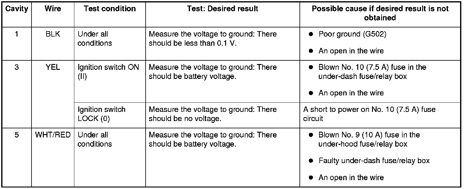4. Reconnect the connector, and do these input tests at the following connector.