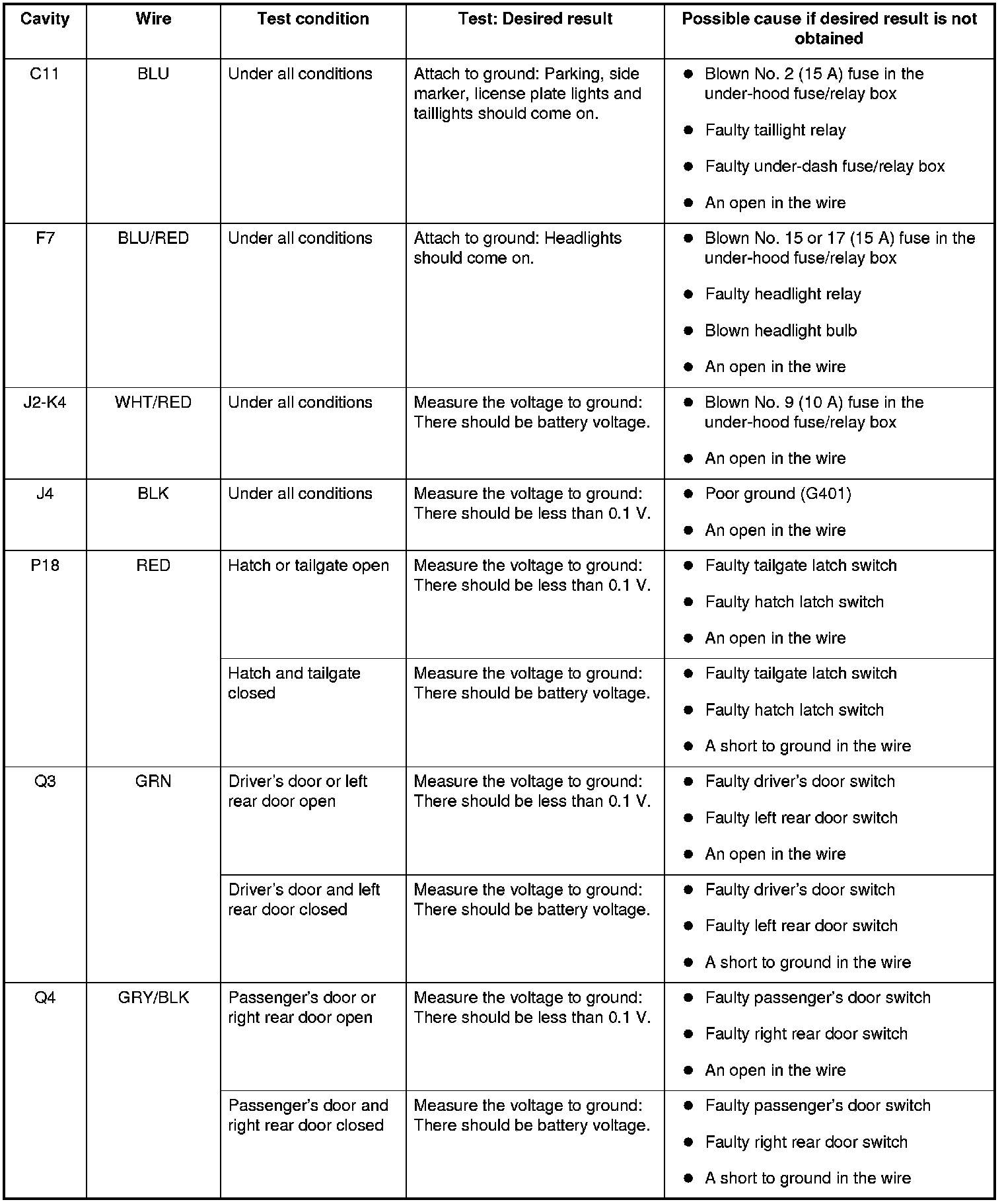 4. Reconnect all connections to the under-dash fuse/relay box, and do these input tests at the following connectors on the under-dash fuse/relay box.