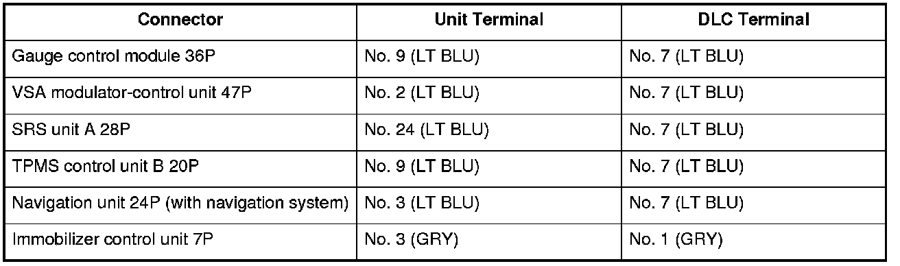 NO - Repair short in the wire between DLC No. 7 (K-line) and the VSA modulator-control unit, the SRS unit, the navigation unit, the TPMS control unit, or the gauge control module, or DLC No. 1 (DIAG-H line) and the immobilizer control unit.