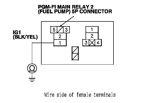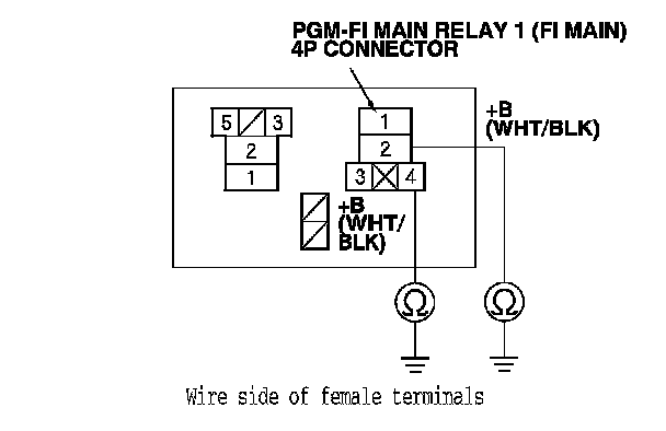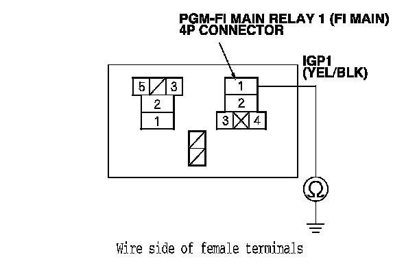 44. Check for continuity between PGM-FI main relay 1 (FI MAIN) 4P connector terminal No. 1 and body ground.