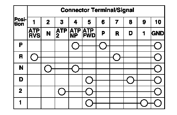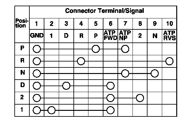 6. Check for continuity between the terminals at the transmission range switch connector. There should be continuity between the terminals in the following table for each transmission range switch position.