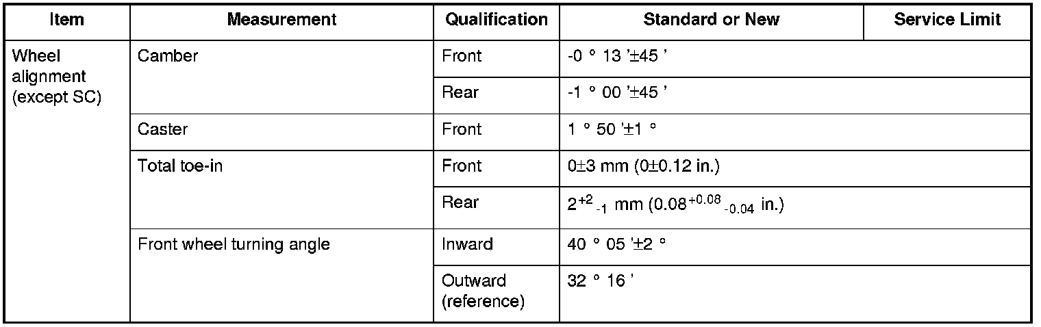 Wheel Alignment Specifications (Except SC Models)