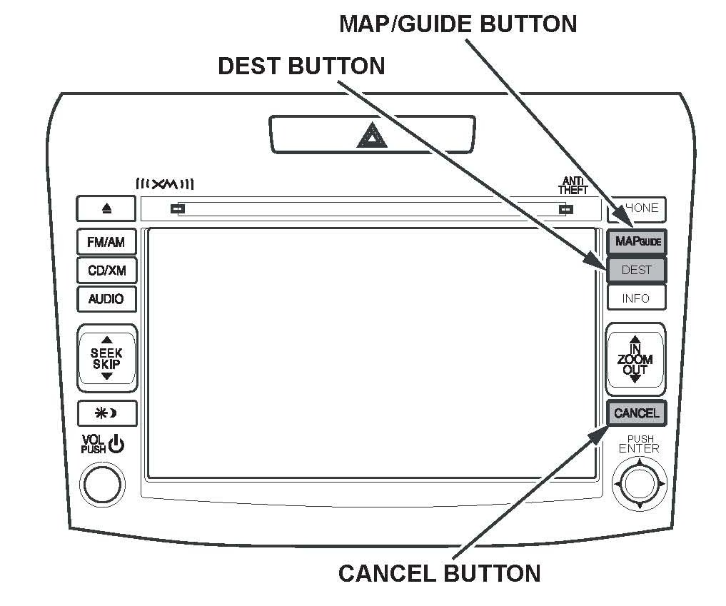 8. Wait for the navigation system to boot up. When the disclaimer screen appears, press and hold the MAP/GUIDE, the DEST, and the CANCEL buttons for at least 5 seconds until the Select Diagnosis Items screen appears.