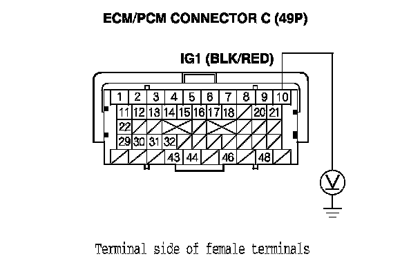 61. Measure the voltage between ECM/PCM connector terminal C10 and body ground.