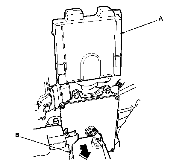 13. Remove the battery holder (B), and reposition the battery away from the ECM/PCM.