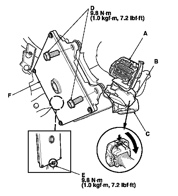 15. Disconnect ECM/PCM connectors A, B, and C, then remove the ECM/PCM (F).