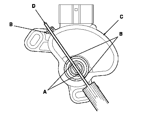 6. Align the cutouts (A) on the rotary-frame with the neutral positioning cutouts (B) on the transmission range switch (C), then put a 2.0 mm (0.08 in.) feeler gauge blade (D) in the cutouts to hold the switch in the N position.
