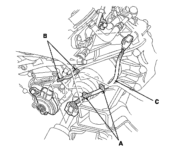 9. If the transmission range switch continuity check is OK, replace the faulty transmission range switch harness; remove the harness clamps (A) from the clamp bracket (B), remove the transmission range switch harness (C).