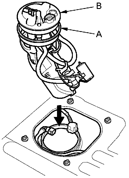 3. Align the marks (B) on the tank and the fuel tank unit, then insert the fuel tank unit into the fuel tank until the fuel tank unit rests on the base gasket.