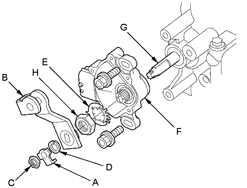 8. Pry the lock tabs of the lock washer (E) on the transmission range switch (F), hold the selector control shaft (G) using a 6.0 mm wrench, and loosen the locknut (H).