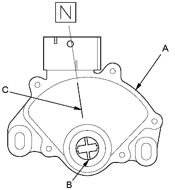 10. Set a new transmission range switch (A) to the N position. The transmission range switch clicks in the N position, and the selector control shaft slot (B) aligns with the N position line (C).