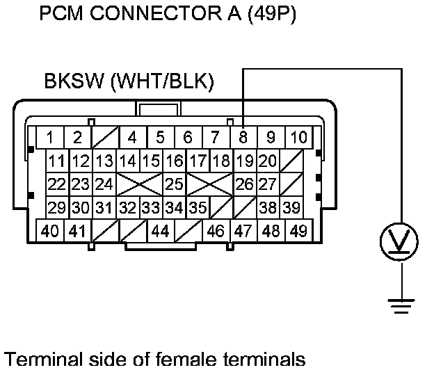 20. Measure the voltage between PCM connector terminal A8 and body ground while pressing the brake pedal and when the brake pedal is released.
