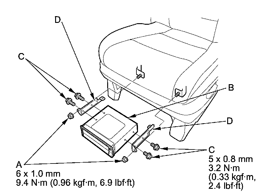 6. Move the driver's seat all the way back, and remove the two mounting nuts (A), then remove the navigation unit (B).