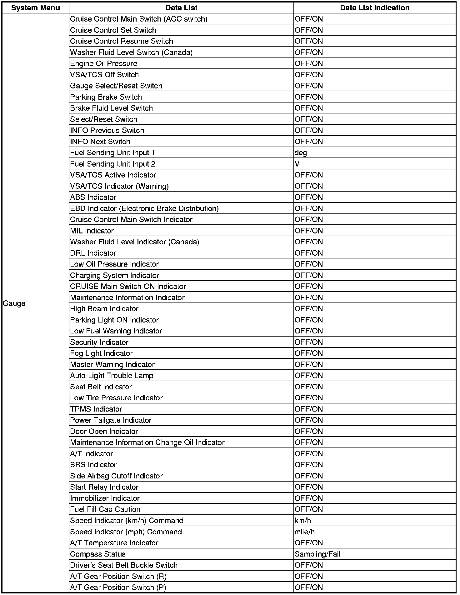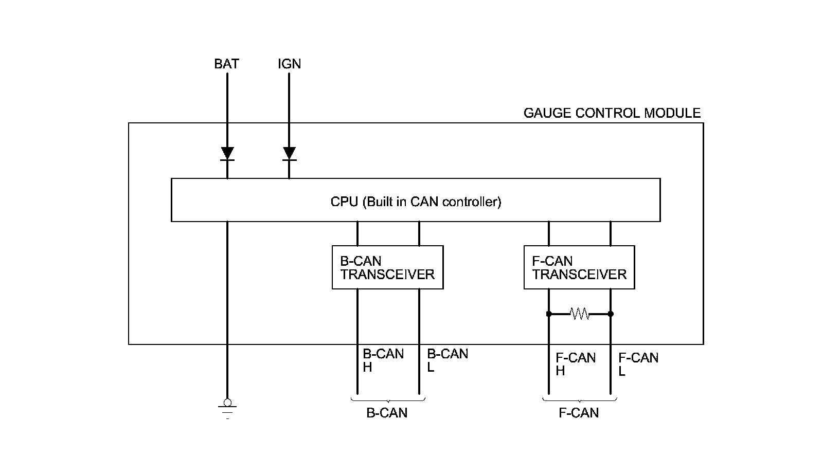 The body controller area network (B-CAN) and the fast controller area network (F-CAN) share information between multiple electronic control units (ECUs). B-CAN communication moves at a slower speed (125 kbps) for convenience related items and for other functions. F-CAN information moves at a faster speed (500 kbps) for "real time" functions such as fuel and emissions data. To allow both systems to share information, the gauge control module translates and relays the information from B-CAN to F-CAN and from F-CAN to B-CAN. This is called the Gateway Function.