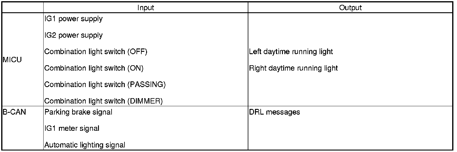 The MICU controls the daytime running lights system based on inputs from each switch and B-CAN data.