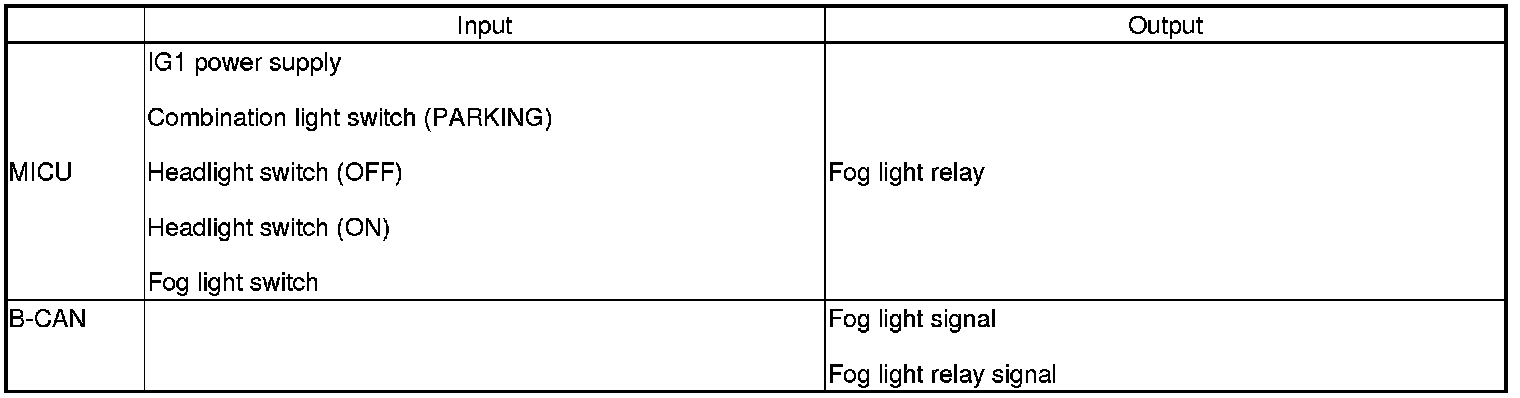 The MICU controls the fog lights based on the IG1, the combination light switch, and the fog light switch inputs.