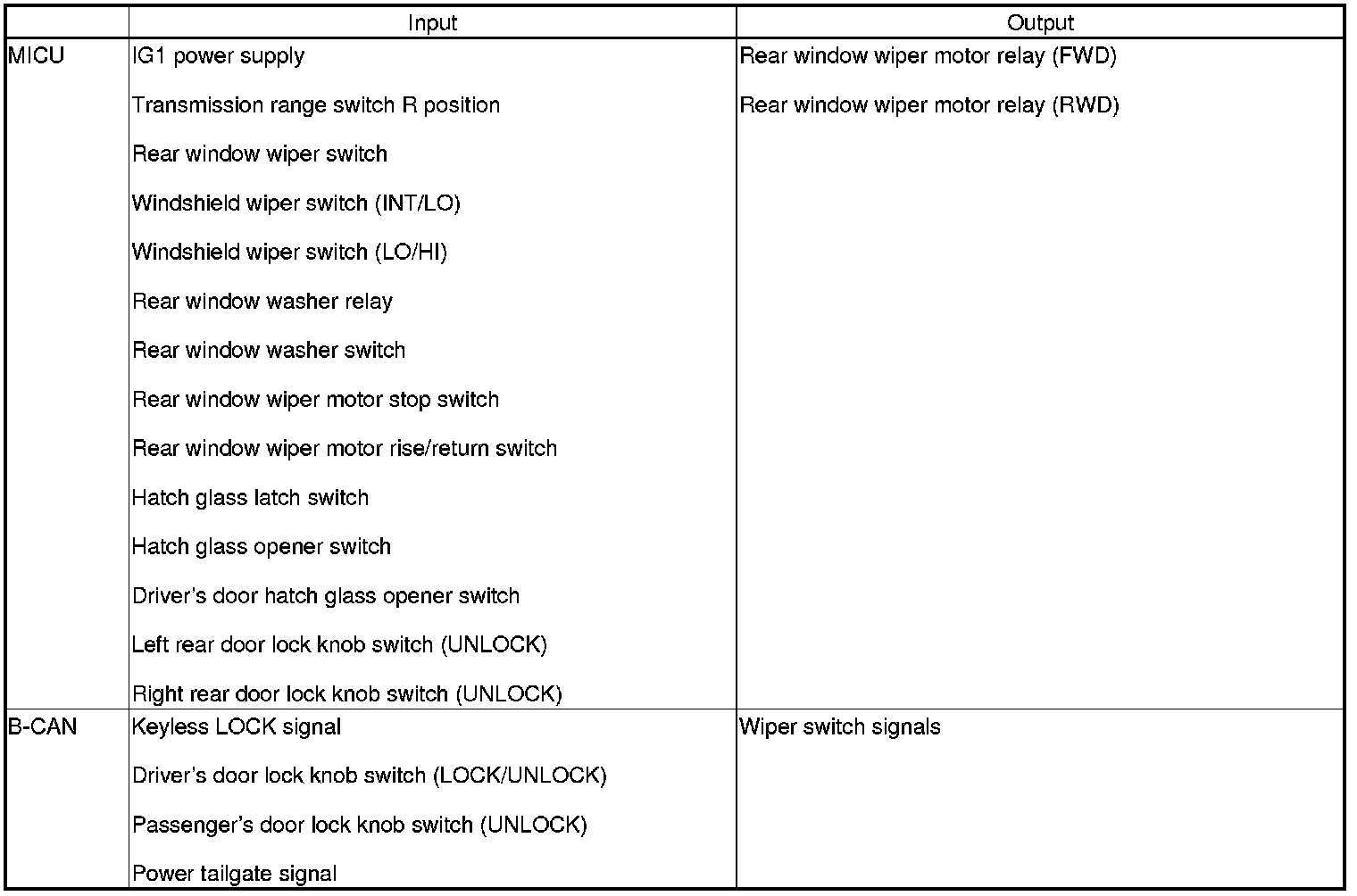 The MICU controls the rear window wiper motor and washer motor based on the wiper/washer switch inputs and B-CAN data.