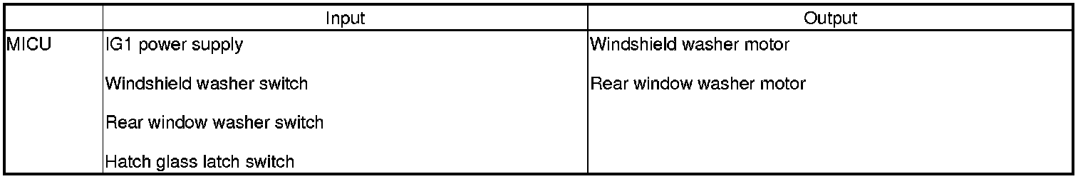 The MICU controls the windshield and rear window washer motor based on the IG1, the washer switches and hatch glass latch switch inputs.