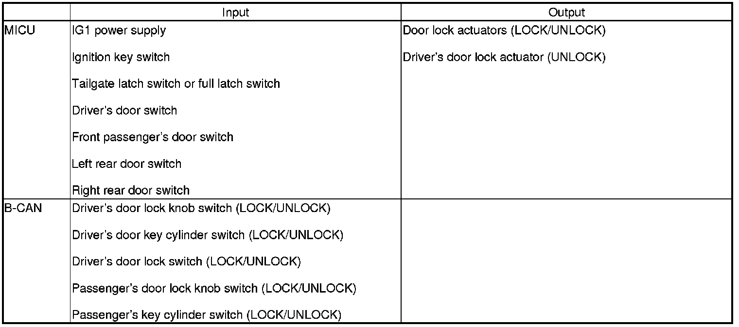 The MICU controls the door lock actuators based on inputs from each switch and B-CAN data.