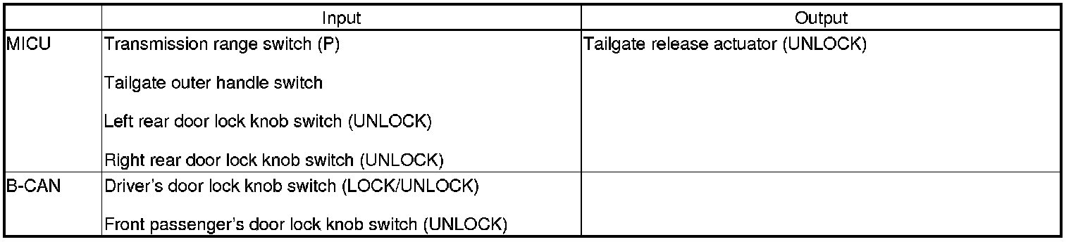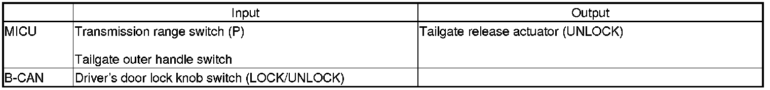 The MICU controls the tailgate release actuator based on inputs from each switch and B-CAN data.