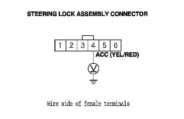 7. Measure the voltage between steering lock assembly connector terminal No. 4 and body ground.