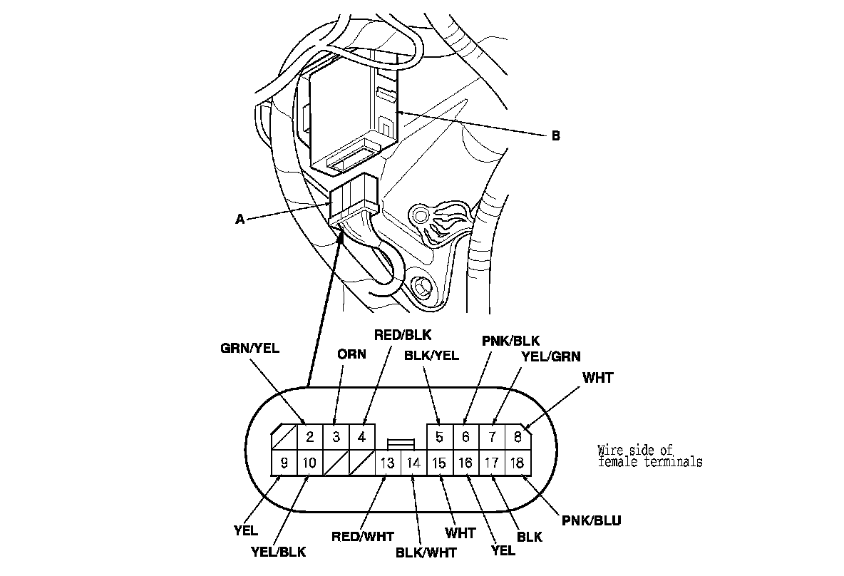 1. Disconnect the 18P connector (A) from the keyless door lock control unit (B).