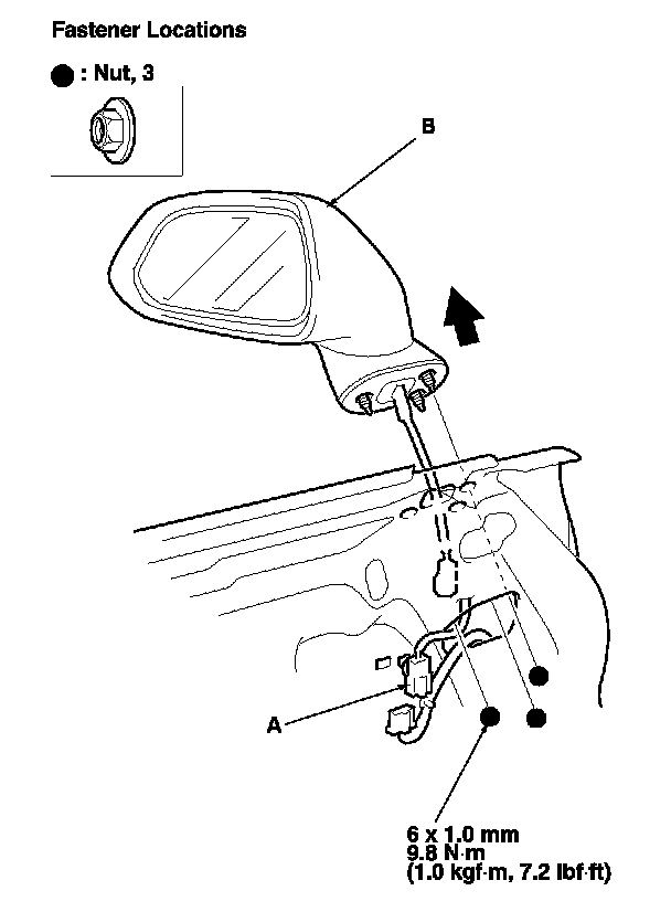 3. While holding the mirror (B), remove the nuts securing the mirror.