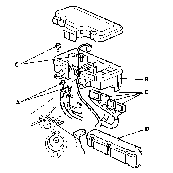 3. Remove the bolts (C) securing the main under-hood fuse/relay box.