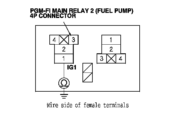 49. Check for continuity between PGM-FI main relay 2 (FUEL PUMP) 4P connector terminal No. 1 and body ground.