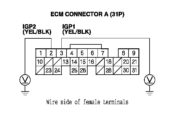 68. Measure the voltage between body ground and ECM connector terminals A2 and A3 individually.